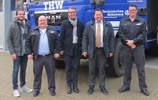 Der Ortsverband bekommt mehr Finanzmittel V.l. Jan-Peter Röderer, Markus Haas, Dr. Lars Castellucci, Martin Gerster und Björn Fellhauer. (Foto: Claudia Richter)(cr) Der THW Ortsverband Eberbach hatte gestern politischen Besuch aus Berlin. Die SPD-Bundestagsabgeordneten Dr. Lars Castellucci und Martin Gerster sowie der stellvertretende Vorsitzende des SPD-Ortsvereins, Jan-Peter Röderer, suchten das Gespräch mit aktiven THWlern im fast noch neuen Gebäude in der Pleutersbacher Straße.