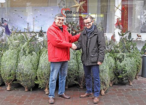 Am Montag übergab Stefan Leukel, der Präsident der Eberbacher Lions, wieder 19 der begehrten Christbäume vor dem AWO-Laden an den Vorsitzenden der AWO-Eberbach, Gustel Mechler.