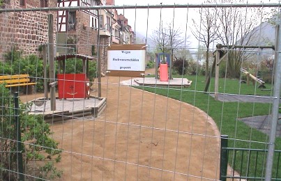 Spielplatz am Pulverturm bleibt gesperrt (Foto:Richter)(hr) Stark in Mitleidenschaft gezogen wurde der Spielplatz am Pulverturm durch das diesjährige Neckar-Hochwasser. Aufgrund der Schlammablagerungen musste auch der Rasen abgetragen und durch neuen Fertigrasen ersetzt werden. Damit das neue Grün richtig anwachsen kann, muss der Spielplatz vorübergehend gesperrt bleiben. Die Stadtverwaltung bittet hierfür um Verständnis.