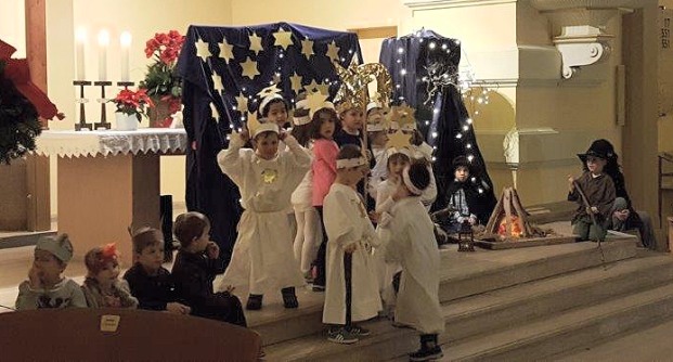 Nach der Begrüßung der Anwesenden durch Pfarrerin Kaltenbacher liefen Kinder und Erzieherinnen gemeinsam in die Kirche ein, um die Weihnachtsgeschichte aufzuführen. Unter ihnen fanden sich zahlreiche goldene Sterne, angeführt vom hellsten Stern über Bethlehem. Danach folgten einige andächtige Hirten, drei Könige, und natürlich durften auch Maria und Josef nicht fehlen.