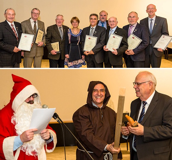 Als weiterer musikalischer Gast bereicherte Elke Kleinert-Endlich das Programm. Besonders die berühmte "Petersburger Schlittenfahrt" in einer Bearbeitung für Querflöte und Klavierbegleitung (Karin Conrath) wusste zu begeistern. Und wie immer durfte auch der Nikolaus (Uwe Fellhauer) mit seinem Knecht Ruprecht (Antonio Frezzato) nicht fehlen: Er hatte wieder in launischen Worten (Text: Wilhelm Bauer) so einiges aus dem Choralltag zu berichten. Für den Ehrenvorsitzenden Eckart Sprenger hatte er sogar extra einen Hobel und Holzbalken dabei - damit der "Schiffsbaumeister" des MGV schon das nächste Bühnenbild in Angriff nehmen kann. Natürlich wurden die anwesenden Kinder vom Nikolaus mit einem Geschenk bedacht und auch einige verdiente Helfer durften als Dank jeweils ein Präsent entgegennehmen. Im Jahr 2017 werden die Seemannslieder dann an der Elbe