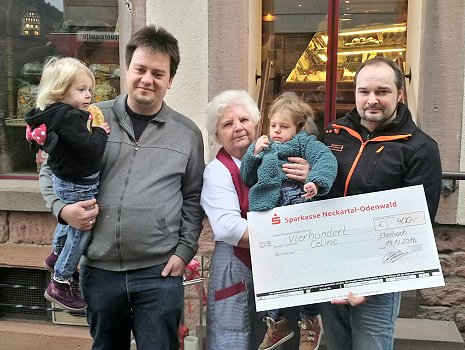 Bäckerei Christian Beisel spendet 400 Euro für Celine V. l.: Celines kleine Schwester, Vater Michael Rosenits, Adelheid Beisel, Celine Rosenits und Geschäftsführer Christian Beisel. (Foto: privat)(bi) Nur wenige Tage vor Weihnachten konnte die Bäckerei Christian Beisel bereits ein besonderes Geschenk vergeben. Eine Spende in Höhe von 400 in Form eines Schecks durften die am RETT-Syndrom erkrankte kleine Celine Rosenits und ihre Familie vom Chef persönlich und seiner Mutter Adelheid Beisel entgegennehmen.