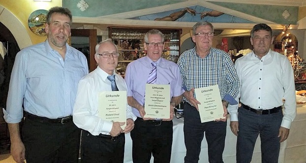 Nach dem gemeinsamen Abendessen wurden einige Sänger für ihre langjährige Mitgliedschaft und Sangestätigkeit geehrt. Roland Dost erhielt die silberne Ehrennadel. Kurt Köhler, Paul Kriegler und Ulrich Zimmermann wurden mit der goldenen Ehrennadel des Vereins ausgezeichnet.