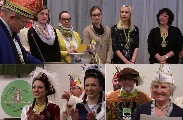 Die Narren übernehmen die Regentschaft Oben Dietmar Beck bei der Ehrung von Tanja Sepp, Carmen Back, Katharina Völker, Madeleine Bohnert und Martina Wäsch (v.l.). Unten der neue Kampagneorden mit den Tanzmariechen Jana Geilsdörfer und Anna-Lena Kappes (v.l.), rechts die neue Ehrensenatorin Christa Wernz mit "Herold" Dieter Müller. (Fotos: Hubert Richter)(hr) Beim traditionellen Neujahrsempfang der Karnevalgesellschaft (KG) Kuckuck übernahmen die Narren heute wieder offiziell die Regentschaft in Eberbach. Die Schlüsselgewalt im Rathaus behalten sie nun - zumindest symbolisch - bis zum Aschermittwoch in genau zwei Monaten.