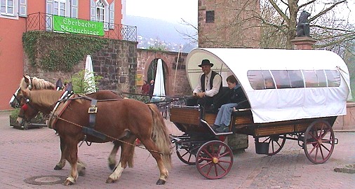 Mit zwei Pferdestärken zum Bärlauch (Foto:Richter)(hr) Kurz nach 10 Uhr heute morgen startete die zweite und letzte Kutschfahrt im Rahmen der diesjährigen Eberbacher Bärlauchtage. Kutscher Björn Schmitt und seine beiden Pferde fuhren ihre Gäste zu den Bärlauchbeständen in der Au, bevor es dann zum Bärlauch-Weißwurstessen ins Hotel "Krone-Post" ging.