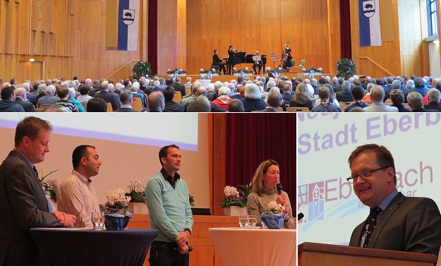 Bürgermeister wirbt um Zuversicht - Talkrunde zum Thema Integration Links unten die Talkrunde mit Bürgermeister Peter Reichert, Zeynel Ücleroglu, Özgün Öz und Nathalie Hempel (v.l., Fotos: Hubert Richter/Claudia Richter).(hr) Im großen Saal der Stadthalle fand heute Vormittag der alljährliche Neujahrsempfang der Stadtverwaltung Eberbach statt.