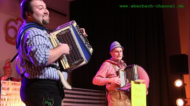 Viel Beifall gab es auch für den jüngsten Büttenredner Hannes Zimmermann als angehender Filmstar, und mit Willi Rebscher stand kurze Zeit später ein echter “Pechvogel” in der Bütt. Dennis Nussbeutel, der für die musikalische Begleitung der Sitzung sorgte, lieferte zusammen mit Johann “Wastl” Bachl als “Napalm Duo” eine volkstümliche Gesangsnummer ab. Bachl war kurz vorher von Bürgermeister Peter Reichert der Fastnachtsorden der Stadt Eberbach, “Lachender Eber”, verliehen worden.