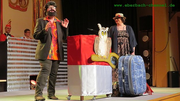 Dieter Verfürth und Tina Kämmler ließen als “Owl Thunder” in ihrer Musikrevue unter anderem den Rockenauer Fahnenstreit wieder aufleben. Barbara Krawczyk behandelte als Krankenschwester in der Bütt das Fastnachtsfieber, nachdem sie Eulenspiegel-Präsident Dieter Redder gekonnt aus einer Ohnmacht geholt hatte. Das neue Trio “Singeulen” (Dieter Redder, Roland Schneider und Stefanie Schölch) stimmte eine zur Melodie des Giesinger-Hits "80 Millionen" gedichtete Hymne auf den Club an, und Sandra Dietz erzählte zusammen mit Carola Zimmermann von einer pannenreichen Weltreise.