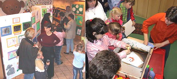 Kleine Künstler stellten aus (Fotos:Richter)(hr) Regen Zuspruch fand heute nachmittag die Ausstellung "Kinder-Kunst" im Katholischen Kindergarten St.Josef in der Waldstraße. Zahlreiche Eltern, Kinder und ganze Familien schlenderten durch die Räume und bewunderten die Kunstwerke, die die Kindergarten-Kinder in den letzten Jahren gebastelt, gemalt, gebaut und genäht hatten. Alle Erzieherinnen waren heute vorort und sorgten zusammen mit einigen Eltern für ein gutes Ambiente während der Vernissage. Zur Begrüßung gab es einen Cocktail, ebenso konnte man bei selbstgebackenem Kuchen und Kaffee gemütlich mit den Besuchern die Atmosphäre genießen. Der Turnraum wurde als Atelier genutzt, in dem die großen und kleinen Künstler unter Anleitung von Erzieherinnen kreativ werden konnten.
