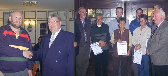 Fanfarenzug wählte Günter Müller - Karl Frieder Peters Ehrenvorsitzender Linkes Bild: Karl-Frieder Peters gratuliert dem neuen Vorsitzenden Günter Müller (links). Rechtes Bild: die Geehrten mit Bürgermeister-Stellvertreter Hermann Bussemer (rechts). (Fotos:privat)(hr) (bm) Der Fanfarenzug der Stadt Eberbach führte vorgestern seine Jahreshauptversammlung für das Geschäftsjahr 2001 durch. Nach den Berichten der einzelnen Fachressorts standen die Ehrungen auf dem Programm. Geehrt wurden: Wolfgang Joho (5 Jahre), Norbert Schmitt (15 Jahre) Jens Schilla und Michael Emig (jeweils 20 Jahre), Gretel Ostertag, Hubert Bauer, Harald Rupp und Claudia Müller (jeweils 25 Jahre). Für 30 Jahre Mitgliedschaft wurde Thomas Schwarz geehrt. Auf eine 35-jährige Mitgliedschaft konnten Dieter Müller und Michael Raab zurückblicken. Als nächstes stand die Wahl des neuen Vorstands auf dem Programm. Das Gründungsmitglied Karl-Frieder Peters, mittlerweile 42 Jahre beim Fanfarenzug, davon 26 Jahre als 1.Vorsitzender, stellte sich, wie schon vorher angekündigt, nicht mehr zur Wahl. Die Wahlleitung übernahm Bürgermeistervertreter Hermann Bussemer. Nach der geheimen Wahl wurde Günter Müller mit überwältigender Mehrheit zum neuen 1.Vorsitzenden des Fanfarenzugs gewählt. Die weitere Vorstandschaft gliedert sich wie folgt: Stabführer wurde Jochen Benkwitz, Musikalischer Leiter Alfred Huber, Gruppenführervertreter Martin Schramm, Kassenwart Claudia Lenz. Kassenprüfer Karl-Heinz Dietz und Hubert Bauer. Die beiden Beisitzer der Stadt, vom Gemeinderat bestellt, blieben Dieter Jeitner und Hermann Bussemer. Für den Vergnügungsausschuss stellten sich folgende Personen zur Verfügung: Melanie Benkwitz, Stefanie Kaiser, Sabrina Münch, Melanie Schramm, Timo Lenz und Oliver Sauer. Die neue Vorstandschaft wurde auf die Dauer von vier Jahren gewählt. Zum Abschluss wurde Karl- Frieder Peters einstimmig zum Ehrenvorsitzenden des Fanfarenzugs der Stadt Eberbach ernannt.