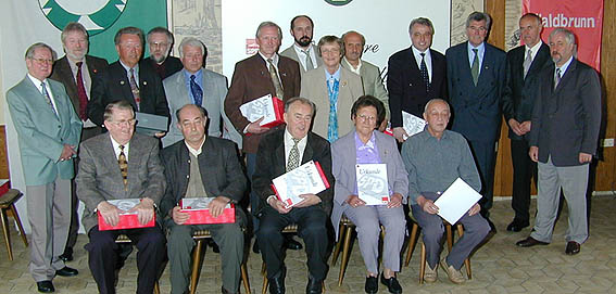SPD ehrte Waldbrunner Mitglieder Beim 40-jährigen Jubiläum der Waldbrunner SPD wurden auch Mitglieder geehrt. Das Foto zeigt die Geehrten zusammen mit Umweltminister a.D. Harald B. Schäfer (3.v.r), MdB Brigitte Adler (8.v.r), MdL Gerd Teßmer (rechts) und Vorsitzenden Wilfried Münch (2.v.r.). (Foto:Baumgartner)(tb) Bei der Feier zum 40-jährigen Jubiläum des SPD-Ortsvereins Waldbrunn heute Mittag, der u.a. auch Umweltminister a.D. Harald B. Schäfer, MdB Brigitte Adler und MdL Gerd Teßmer beiwohnten (wir werden davon ausführlich berichten), gab es auch Ehrungen langjähriger Mitglieder, die zum Teil auch schön länger der SPD angehören, als es den Ortsverein gibt. Es waren dies: Helmut Stoeckl, Ruth Lenz, Karl Hagendorn, Klaus Schölch, Willi Kessler (alle 20 Jahre), Willi-Friedrich Volz (25 Jahre), Alwin Hinrich, Dieter Krieger, Werner Guckenhahn, Manfred Kuhn, Waldemar Koch, Heinz Henrich, Karl Haass, Wolfgang Bracht, Christel Schnetter, Rolf Schell, Dieter Wiersdorf, Guido Schäfer, Willi Krieger, Karl Deschner, Karl-Heinz Wetterauer, Heinz Schölch, Wilhelm Schmitt und Helmut Deschner (alle 30 Jahre). 35 Jahre gehört Rudolf Freihaut der SPD an. Auf 40 Jahre Mitgliedschaft in der SPD können Gerhard Hauck, Adam Schölch und Carl-August Niemann zurückblicken. 50 Jahre gehört Willi Neureuther der SPD an. Schon bei seinem 90. Geburtstag wurde mit Ernst Müller das dienstälteste Mitglied des Neckar-Odenwald-Kreises für über 55-jährige Mitgliedschaft in der Sozialdemokratischen Partei Deutschlands geehrt.