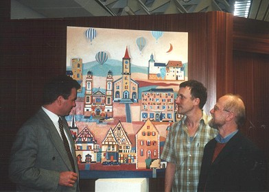 Neues Eberbach-Gemälde in limitierter Poster-Edition (Foto:Volksbank)(hr) Heute abend wird um 19 Uhr in der Volksbank Neckartal in Eberbach eine Ausstellung mit Werken von Gerhard Hofmann eröffnet. Im Mittelpunkt steht ein neu geschaffenes Eberbach-Gemälde, das Bürgermeister Bernhard Martin (links) während des Aufbaus der Ausstellung begutachtete. Von diesem Gemälde wurde ein Poster angefertigt. Verleger Petschmann (rechts), der die Ausstellung begleitet, überreichte dem Stadtoberhaupt im Beisein des Künstlers (2.v.r.) die Nummer 1 des Original-Plakats, das in handnummerierter, limitierter Auflage, vom Künstler signiert, zur Ausstellung erscheint.
