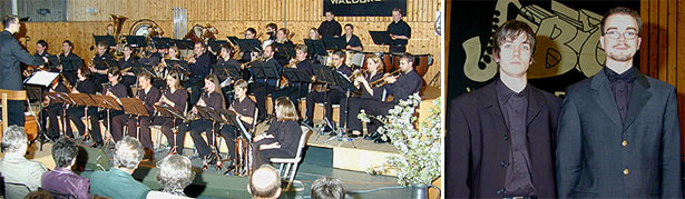 Jugendblasorchester bleibt auf hohem Niveau Das Frühjahrskonzert des Jugendblasorchesters Waldbrunn war eine gelungene Sache, bei dem die Nachwuchsdirigenten Jens Holzinger (rechts) und Peter Schäfer ihre Feuertaufe mit Bravour bestanden. (Fotos: Baumgartner)(tb) Eine prall gefüllte Schulturnhalle erwartete heute die jungen Musikerinnen und Musiker des Jugendblasorchesters Waldbrunn zum diesjährigen Frühjahrskonzert. Es war dies die Feuertaufe für die beiden aus dem Orchester hervorgegangenen jungen Nachwuchsdirigenten Jens Holzinger und Peter Schäfer. Vorweg gesagt: Sie bestanden sie mit Bravour. Auch können sie das musikalische Niveau der jungen Musikerinnen und Musiker auf der Höhe halten, auf dem sie es von ihrem Vorgänger Georg Friedrich Sündermann Ende des vergangenen Jahres übernommen hatten. Im Programm, welches von Schlager bis südamerikanische Rhythmen so einiges in sich hatte, war vor allem moderne Blasmusik angesagt, die die zahlreichen Konzertbesucher begeisterte. Obligatorisch waren die nach Standing Ovations geforderten Zugaben. Bei der letzten Zugabe schwang nochmals mit Georg Friedrich Sündermann, der Ehrendirigent und langjährige musikalische Leiter des Jugendblasorchesters Waldbrunn, den Taktstock.