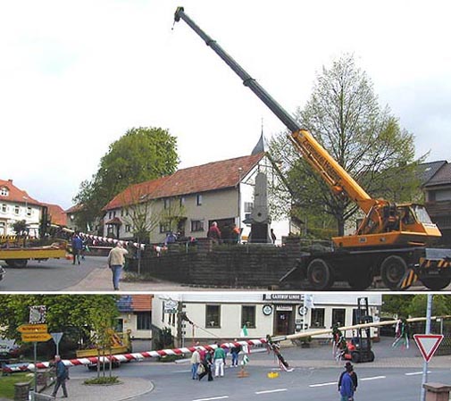 Ist es der höchste Maibaum in der Region ? Einer der höchsten Maibäume der Region steht mit 33,5 Metern in Schollbrunn. Unsere Fotos entstanden beim traditionellen Aufstellen des Baumes. (Fotos:Baumgartner)(tb) Seit nahezu 25 Jahren wird alljährlich in Schollbrunn ein stattlicher Maibaum gestellt, wofür sich stets der Ortschaftsrat verantwortlich zeichnet. Die Idee zum Stellen eines Maibaumes in Schollbrunn hatte anfangs der Jagdpächter Karl Scholl. Nach dessen Tod hat sich Lothar Holzner, Inhaber des Zimmergeschäftes Holzner, nicht lange Bitten lassen und diese Tradition fortgeführt. Im Zuge der Umgestaltung des Dorfplatzes in Schollbrunn wurde auch für den Maibaum eine neue Befestigungskonstruktion nach Plänen von Lothar Holzner und anderen Fachkräften gefertigt. Mit dieser Neukonstruktion lässt sich das Stellen des Maibaumes nun um einiges einfacher bewerkstelligen.