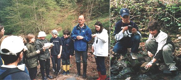 Fünftklässler erforschen den Pleutersbach Links: Vorort-Besprechung mit Jochen Rohrmoser (2.v.r.), rechts: Zwei Fünftklässler auf der Suche nach Bachgetier. (Fotos:Bernecker)(hr) (be) Eine anspruchvolle Aufgabe haben die Schülerinnen und Schüler der fünften Klassenstufe des Hohenstaufen-Gymnasiums Eberbach ins Visier genommen: Im Rahmen des Geografieunterrichts soll übers Jahr jeweils in kleineren Arbeitsgruppen der Pleutersbach von seiner Neckarmündung bis zur Gemarkungsgrenze erkundet werden. Dabei wollen sich die Nachwuchslimnologen intensiv mit gewässerbiologischen Fragestellungen zur Natürlichkeit des Baches, zur Flora und Fauna, zur chemischen und physikalischen Beschaffenheit und zu möglichen Wanderbarrieren für Gewässerorganismen auseinander setzen. Angeleitet werden sie von ihren Fachlehrern Jochen Rohrmoser und Jutta Gewahl in enger Zusammenarbeit mit Klemens Bernecker vom Umweltamt der Stadt.