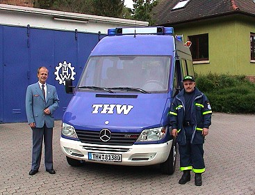 Eberbacher THW hat ein neues Transportfahrzeug (Foto:Richter)(hr) Über einen nagelneuen Mercedes-Transporter verfügt der Eberbacher Ortsverband des Technischen Hilfswerks (THW) seit gestern. Der Neunsitzer ist im Technischen Zug des THW für den Personen- und Gerätetransport sowie als Einsatzleitfahrzeug vorgesehen. Er ersetzt einen 16 Jahre alten Ford Transit. Unser Bild zeigt den THW-Ortsbeauftragten Ulrich Schaffer (links) und Zugführer Markus Haas mit dem rund 35.000 Euro teuren Fahrzeug.