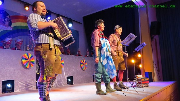 Ein Höhepunkt bei den musikalischen Darbietungen bildete gegen Ende nach Mitternacht wieder Johann “Wastl” Bachl als Rettungstaucher mit Akkordeon und - im ersten Sitzungsteil - gemeinsam mit Dennis Nussbeutel und Angela Frömming als “Bayern, des samma mia...”. Nussbeutel sorgte auch für die Musikbegleitung und so manche Schunkelrunde während der Sitzung. Dieter Redder, Roland Schneider und Stefanie Schölch knüpften mit viel Gold in den Kehlen als “Singeulen” an den Erfolg ihrer letztjährigen Premiere an.