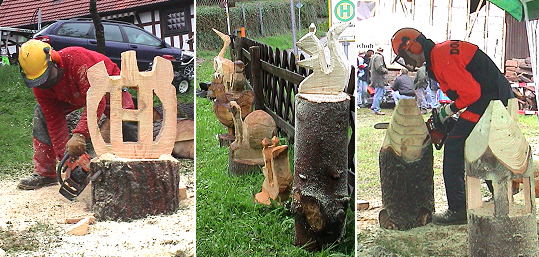 Lautstarke Schnitzereien in Sensbachtal (Fotos:Richter)(hr) Heute und morgen lädt die Firma Ralf Beisel in Hebstahl zum Tag der offenen Tür. Neben allerlei Motorsägen, Freischneidern, Rasenmähern, Spaltmaschinen, Häckslern und sonstigen Ausrüstungsgegenständen für die Wald- und Gartenarbeit gibt es auch wieder Kreatives mit der Motorsäge zu bestaunen. Profis aus der Region zeigen, dass mit der vermeintlich groben Sägekette aus einem Holzklotz selbst filigrane Kunstwerke wie Tierskulpturen, Pilze, Bäumchen und andere Figuren entstehen können. Unsere Bilder zeigen links den Heidelberger Michael Roth und rechts Sven Ihrig aus Waldbrunn, der im Stadtwald Eberbach seine Forstwirt-Ausbildung absolvierte und mittlerweile Mitglied des Baden-Württemberg-Teams für die Waldarbeitermeisterschaften ist.