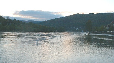 Neckar schwappte wieder auf den Lauer (Foto:Richter)(hr) Am Wochenende sorgte lang anhaltender Regen auch wieder für ein Ansteigen des Neckarpegels. Nachdem die Stadtverwaltung bereits am Samstagvormittag bei einem Pegelstand von rund 3,50 m den Neckarlauer vorsorglich sperren ließ, stieg der Flusspegel bis Nachmittag auf über 4 m an. In der Nacht zum Sonntag schwappte das Wasser dann tatsächlich auf die Parkplätze am Lauer. Gegen 2.30 Uhr musste ein Wohnmobil, dessen Halter nicht greifbar war, durch einen Abschleppdienst auf die B 37 gezogen werden. Seinen Höchststand erreichte der Neckar am Sonntagvormittag bei 4,80 m, bevor das Wasser sich dann allmählich wieder zurückzog, da inzwischen auch die Regenfälle aufgehört hatten.