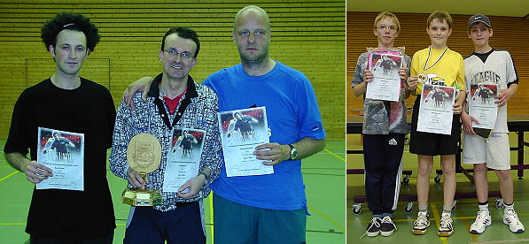 Stärkste Konkurrenz seit Jahren bei TT-Meisterschaft Tischtennis-Vereinsmeister bei den Herren wurde Horst Wacker (Mitte) vor Murat Esgin (li.) und Walter Hartmann (re.). Vereinsmeister bei den Schülern wurde Mauritius Schell (Mitte) vor Patrick Nitsch (li.) und Christoph Markuszewski. (Fotos: Bayer)(jc) (hf) Horst Wacker bei den Herren und Mauritius Schell bei den Schülern sind die neuen Tischtennis-Vereinsmeister des TV Eberbach.