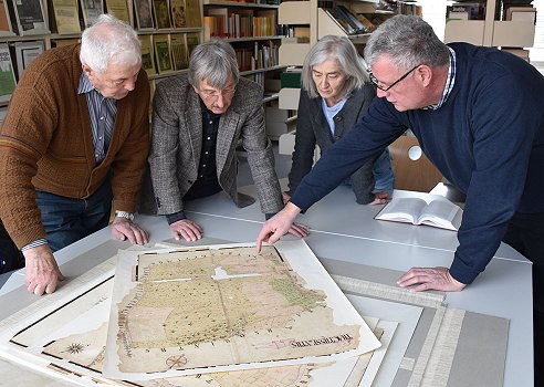 Große Flurkarten aus dem 18. Jahrhundert vervollständigen Ortsarchiv  Sehr interessiert: v. l.: Georg Herbert Ihrig, Klaus Weber, Anja Hering und Thomas Ihrig schauen sich im Kreisarchiv des Odenwaldkreises die Schöllenbacher Flurkarten aus dem 18. Jahrhundert an. Solange die Karten im Ortsarchiv in Hesselbach nicht fachgerecht gelagert werden konnten, wurden sie im Kreisarchiv aufbewahrt. (Foto Stefan Toepfer/Kreisverwaltung)(bro) (stt) Johann Wilhelm Grimm muss ein ziemlich dickes Fell gehabt haben, damals im Odenwald. Zahlungsunwillige Gemeinden, aufmüpfige Bürger oder unzuverlässige Mitarbeiter machten dem Landvermesser mitunter arg zu schaffen. Mehrfach musste er sich bei der Regierung des Hauses Erbach-Fürstenau beschweren, in dessen Auftrag er Flurkarten erstellte, die der Obrigkeit bei einer gerechten Besteuerung helfen und Eigentumsfragen klären sollten. Von 1749 bis 1757 war Grimm unterwegs und hat von zahlreichen Odenwälder Kommunen Karten angefertigt. Zum Beispiel von Schöllenbach, wo er seine Arbeit 1754 beendete.