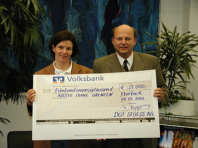 DGF Stoess spendet 25.000 Euro an „Ärzte ohne Grenzen“ Dr.Epp-Graak und Michael Teppner bei der Scheckübergabe (Foto:Claussen)(jc) Die Deutsche Gelatine-Fabriken Stoess AG mit Sitz in Eberbach spendet 25.000 Euro an "Ärzte ohne Grenzen". Die 1971 gegründete private Organisation bringt in mehr als 80 Ländern weltweit Menschen in Kriegsgebieten und Opfern von Naturkatastrophen schnell und professionell ärztliche Hilfe.
