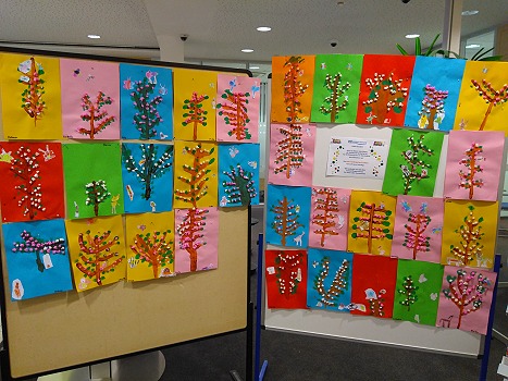 Im Gepäck hatten sie kunterbunte Frühlingsbilder, auf denen mit Farbe und Seidenpapier blühende Bäume abgebildet wurden und die in den nächsten Wochen in der Schalterhalle bewundert werden können.