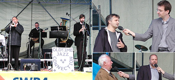 SWR- „Platzkonzert“ live vom Leopoldsplatz Links: Old Time Jazz Connection, Rechts,oben Matthias Wiest im Gespräch mit Hubert Richter (links), unten Hermann Bussemer (links) und Dietrich Müller bei ihren Interviews (Fotos:Claussen)(jc) Heute jazzte auf Einladung des Kulturamts die „Old Time Jazz Connection auf dem Leopoldsplatz und bot damit den musikalischen Rahmen für das „Platzkonzert“ des SWR4-Programms „Kurpfalzradio“. Aufgrund der schlechten Witterung fanden sich nur zögernd Zuseher und -hörer vor dem Rathaus ein. Die von Matthias Wiest moderierte Sendung hatte neben mundgeblasener und handgezupfter Musik, ohne elektronische Hilfsmittel, genügend Raum für ausführliche Interviews mit interessanten Gesprächspartnern aus Eberbach zu bieten. Neben dem stellvertretenden Bürgermeister, Hermann Bussemer, dem Leiter des Stadtarchivs, Dr. Rüdiger Lenz, Buchautor Dr. Dieter Röckel und dem Vertreter des Einzelhandels, Dietrich Müller kam auch Hubert Richter vom Eberbach-Channel zu Wort. Nach einem Interview vor einigen Monaten im Frühprogramm des Senders, war dies bereits der zweite „Live-Auftritt“ des Channel-Initiators bei Kurpfalz-Radio, was von anhaltendem Interesse an dem Eberbacher Online-Magazin, auch über die Grenzen der Stadt hinaus, zeugt.