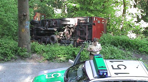 Bremsen versagten (Foto:Richter)(hr) Viel Glück hatte heute vormittag ein 44-jähriger LKW-Fahrer aus Lampertheim. Als er mit seinem 7,5-Tonner auf der K 4113 von Waldkatzenbach nach Gaimühle unterwegs war, versagten auf der abschüssigen Straße die Bremsen. In einer scharfen Rechtskurve schoss der Brummi dann geradeaus die Böschung hinunter, wo er auf der Seite liegen blieb. Der Fahrer blieb unverletzt. Der LKW war morgen für die TÜV-Untersuchung vorgesehen.