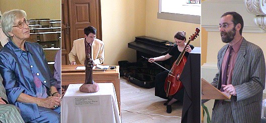 Warten heißt, das Leben offen zu halten Links die Künstlerin Gudrun Teßmer, Achim Plagge und Anja Eckert (Mitte), rechts Ekkehard Leytz bei seinem Vortrag. (Fotos:Richter)(hr) (ra) Gudrun Teßmer wuchs in Schlesien und Berlin auf, heute lebt sie in Eberbach. Plastiken wie "Die Wartende" spiegeln Krieg und Vertreibung als prägende Erlebnisse. Ein Gesicht, aus Odenwälder Sandstein gehauen, lenkt den "Blick nach Innen". Pfarrer Ekkehard Leytz eröffnete ihre Ausstellung in der Michaelskirche heute vormittag vor erfreulich großem Publikum.