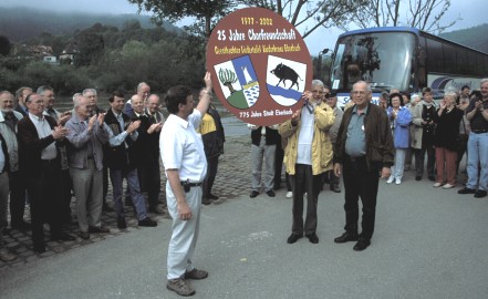 Chorfreundschaft auf abwechslungsreiche Weise gefeiert Jörg von Have und Olaf Fries von der Geesthachter Liedertafel mit der von Eckart Sprenger zur Erinnerung an die Chorfreundschaft überreichten Jubiläumstafel. (Foto:Held)(tw) (ah) Die seit 25 Jahren bestehende Chorfreundschaft zwischen dem MGV Liederkranz und der Geesthachter Liedertafel wurde nicht nur durch das gemeinsame Jubiläumskonzert weiter vertieft. Für fünf Tage hielten sich die Gäste von der Elbe – dieses Mal begleitet vom neu gegründeten Damenchor – am Neckar auf, wo der Liederkranz ein vielfältiges Programm zusammengestellt hatte.