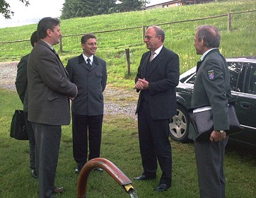 Ministerbesuch im Forstamt Beerfelden Forstamtsleiter Norbert Sasse (links) im Gespräch mit Minister Wilhelm Dietzel (2.v.r.). (Foto:privat)(hr) Der für Landwirtschaft und Forsten zuständige Hessische Staatsminister Wilhelm Dietzel stattete dieser Tage dem Forstamt Beerfelden einen Besuch ab, um sich vorort über die forstliche Lage und die bestehenden Probleme der Mitarbeiter zu informieren. Zugegen war auch Michael Gerst, Chef des vor eineinhalb Jahren aus der Landesforstverwaltung entstandenen Landesbetriebes HESSEN-FORST. Der Meinungsaustausch fand in der Sportler-Hütte in Airlenbach statt, wo die Landfrauenvereinigung Airlenbach ein deftiges Odenwälder Frühstück für den Besuch gerichtet hatte. In offener Gesprächsrunde konnten Forstwirte, Angestellte und Förster ihre Sorgen und Vorstellungen der Betriebsleitung und Regierung vortragen. Auch wenn nicht bei allen Fragestellungen sofort konkrete Antworten gegeben werden konnten, empfanden doch alle Mitarbeiterinnen und Mitarbeiter diese Veranstaltung im kleinen Rahmen als geeignete Form, um den Kontakt zwischen politischer Führung, Geschäftsleitung und arbeitender Basis in den Forstämtern zu pflegen.