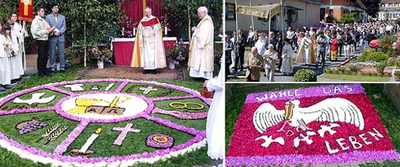 Traditionelle Sakramentsprozession der kath. Kirchengemeinde Kunstvoll gelegte Blumenteppiche sind Tradition bei der alljährlichen Sakramentsprozession an Fronleichnam bei der kath. Kirchengemeinde St. Maria Waldbrunn. (Fotos: Baumgartner)(tb) Heute wird in in vielen Bundesländern das Fronleichnamsfest gefeiert. Auch in Waldbrunn beging die Katholische Kirchengemeinde St. Maria dieses Hochfest mit der traditionellen Sakramentsprozession entlang der kunstvoll gestalteten Blumenteppiche. Schon morgens ab 5 Uhr waren viele fleißige Helferinnen und Helfer, darunter auch Kinder und Jugendliche, mit dem Legen der Blumenteppiche und dem Schmücken der Altäre beschäftigt. Glück hatte man in diesem Jahr auch wieder mit dem Wetter. Nach dem Hochamt führte die Prozession die Gläubigen zunächst an die Kreuzung Richtung Waldkatzenbach, wo man am dortigen Altar für die Bürger und Gäste der Gemeinde Waldbrunn betete. Danach ging es über die Waldkatzenbacher Straße weiter zum Altar in der Siedlerstraße, welcher auch in diesem Jahr wieder von der Kirchenjugend gestaltet wurde. Hier betete man für die Familien und den Priesternachwuchs. Der letzten Altar der Sakramentsprozession war dann vor dem Kaufhaus Brummer, wo man für die Pflegeberufe betete.