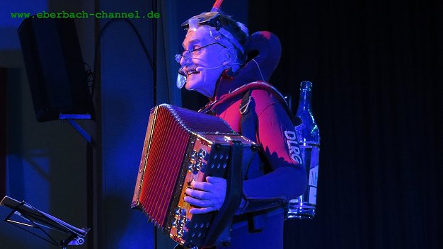 Eine deftige Musik-Bütt lieferte das “bayrische Napalm-Duo” Dennis Nussbeutel und Johann Bachl, und auch Tina Kämmler baute als außerirdische Besucherin höchst irdische Lieder in ihren Vortrag ein. Der Kultstar auf der Eulenbühne, Rettungstaucher Johann “Wastl” Bachl, sang und musizierte aus der Eberbacher Tauchschule und dürfte nicht ohne seinen Hit “Kaulquappensocken” von der Bühne gehen. Die drei “Singeulen” Dieter Redder, Stefanie Schölch und Roland Schneider, sorgten mit einem Schlagermedley für Partylaune und stimmten zum Finale schließlich ihre Eulen-Hymne an. .