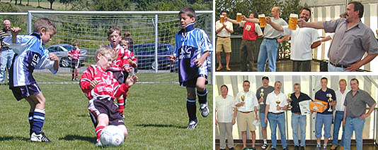Dorfolympiade sorgte für Gaudi Nicht nur Fußball aller Altersklassen (linkes Bild), sondern auch die Dorfolympiade sorgte beim Waldkatzenbacher Sportfest für Unterhaltung. U.a. beim Maßkrugstemmen herrschte Riesenstimmung. Bei der Siegereehrung übergaben die Initiatoren Kurt Back (r.) und Dieter Heil (l.) die Preise an die Mannschaftsführer. (Fotos:Baumgartner) (tb) Heute ging das Sportfest des VfR Waldkatzenbach zu Ende. Vier Tage lang gab es zum Teil spannende Fußballspiele aller Altersklassen und viel Gaudi. Eröffnet wurde das Sportfest mit Firmenspielen am Freitag. Samstags war dann der erste Teil der Waldkatzenbacher "Dorfolympiade" angesagt, bei dem sich ganz Waldkatzenbach beteiligen konnte. Nach Showeinlagen der "Funny-Girls" und der "Activity-Girls" aus Dielbach, sorgten dann im Rahmen des Wettkampfes Spiele wie Sackhüpfen, Skirennen, Pferderennen oder Schubkarrenrennen für eine Riesengaudi. Die Spiele waren so gestaltet, dass sich sowohl Kinder als auch Erwachsene beteiligen konnten. Eingeteilt waren die Mannschaften nach den Waldkatzenbacher Baugebieten. Wie die Initiatoren Kurt Back und Dieter Heil mitteilten, ging es bei den Spielen nicht um Höchstleistungen, sondern hauptsächlich darum, gemeinsam Spaß zu haben. Auch sei ein wichtiger Faktor das Zusammenkommen und Beisammensein der Bevölkerung. Für jedes Spiel gab es Punkte. Glück hatte, wer seinen Joker richtig setzte und seine Punktzahl verdoppeln konnte.