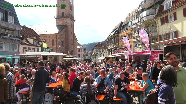 Auf ein überaus gelungenes frühlingshaftes Eventwochenende kann Eberbach heute zurückblicken. Beim ersten Streetfoodfestival auf dem Neuen Markt und in der Bahnhofstraße Ost war schon am Freitagabend einiges los. Am Samstag kamen noch mehr Besucher, und heute, als die EWG parallel dazu zum verkaufsoffenen Sonntag geladen hatte, bildeten sich vor den Food-Trucks lange Schlangen. Auf dem Neuen Markt und in der Bahnhofstraße ging es fast so eng zu wie sonst nur am “Eberbacher Frühling” oder beim “Apfeltag”. Stadtnahe Parkplätze waren heute eine heiß begehrte Mangelware, zumal die Tiefgarage am Leopoldsplatz gesperrt ist.