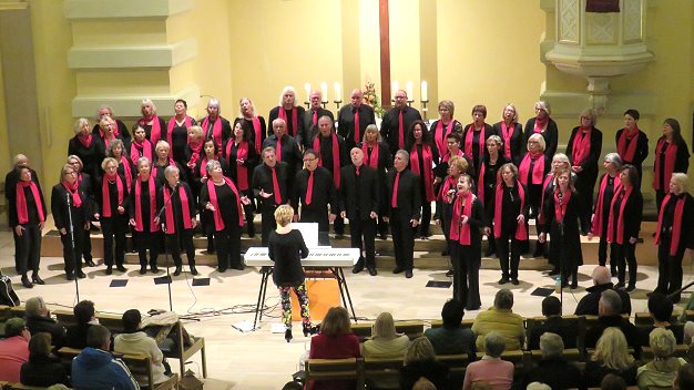 Karin Conrath, die als Chorleiterin vor jedem Lied dem Publikum kurz den Inhalt erläuterte, bekam auf ihre Frage, was man den sonntags morgens so mache, von einigen Gästen gut gelaunt „Ausschlafen” oder „Stammtisch“ als Antwort. Augenzwinkernd berichtigte sie: “In die Kirche gehen!” Daraufhin zeigte der Chor mit einer ausdrucksstarken Version von “Sunday Morning” und einem Solo von Karin Predikant, wie begeisternd das sein kann. Nach jedem Lied applaudierte das Publikum lautstark, und immer mehr Gäste wippten mit den Füßen mit, als “Perfect” von Ed Sheeran, ein Song an dem im vergangenen Jahr wohl niemand vorbeikam, oder “We are the world” mit Soli von Simone Woldrich, Christl Hock, Ulrike Riedl und Markus Beck - wohl eins der bekanntesten Lieder der 1980er Jahre - durch den routinierten und sehr gut aufeinander abgestimmten Chor vorgetragen wurden.