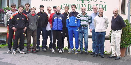DSV- Skisprungmannschaft ließ sich in Eberbach durchchecken Die DSV-Skisprungnationalmannschaft mit Christof Duffner, Alexander Herr, Daniel Klausmann, Michael Neumayer, Michael Uhrmann, Stephan Hocke, Maximilian Mechler, Jörg Ritzerfeld nd Georg Spät, Bundestrainer Reinhard Heß mit seinen Co-Trainern Henry Glaß und Andreas Bauer hielt sich für einen medizinische Ausgangsuntersuchung Ende Mai im Hotel Landgasthof „Grüner Baum“ aus Beerfelden-Gammelsbach auf. Das Foto zeigt die Teilnehmer mit Gastwirt Lothar Denniger (Foto:privat)(jc) (kj) Ende Mai hielt sich die Nationalmannschaft der Skispringer im südlichen Odenwald zu einer sportmedizinischen Untersuchung auf. Die Sportler Christof Duffner, Alexander Herr, Daniel Klausmann, Michael Neumayer, Michael Uhrmann, Stephan Hocke, Maximilian Mechler, Jörg Ritzerfeld und Georg Spät mit Bundestrainer Reinhard Heß, den Co-Trainern Henry Glaß und Andreas Bauer, Mannschaftsarzt Dr. Ernst Jakob und Masseurin Nicole Hoffmeyer hatten sich hierzu einige Tage im Hotel-Landgasthof "Grüner Baum" in Beerfelden-Gammelsbach eingemietet. Mit von der Partie war der ehemalige DSV-Cheftrainer Langlauf Jürgen Wolf (Beerfelden-Etzean), der nun in seiner neuen Eigenschaft als Technischer Leiter Skisprung, neben Rudi Tusch, beim DSV für die Forschung und Entwicklung bei den deutschen "Adlern" verantwortlich zeichnet. Die physiotherapeutischen Untersuchungen standen unter der Zuständigkeit von REHA-Geschäftsführer Norbert Müller und der DSV-Masseurin Nicole Hoffmeyer und wurden im Reha-Zentrum Neckar-Odenwald in Eberbach durchgeführt. Die Trainingseinheiten konnten Dank der Unterstützung von Seiten der Stadt in der Turnhalle in Beerfelden, auf dem Sportplatz und bei Waldläufen in Gammelsbach in aller Ruhe absolviert werden.