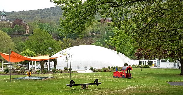 Als Ergebnis einer Klausurtagung des Eberbacher Gemeinderats vor einigen Tagen tauchte diese Möglichkeit auf, denn es gibt tatsächlich schon einige Freibäder in Süddeutschland, die mit einer Traglufthalle ganzjahrestauglich gemacht wurden, beispielsweise in Neustadt an der Weinstraße (unser Bild).