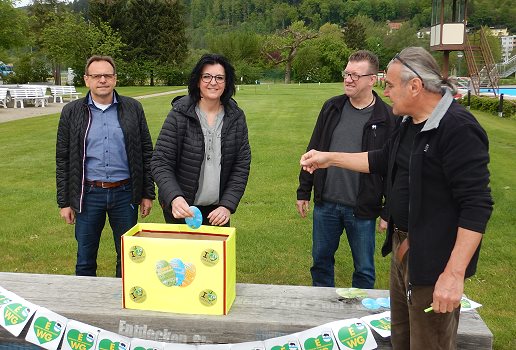 Gutscheine und Freibadkarten wurden verlost V.l. Michael Sigmund, Gabriele Hartmann, Thomas Willimsky und Rolf Wieprecht. (Foto: privat)(cr) (dm) Im Eberbacher Freibad wurden gestern kurz vor Saisonbeginn die Gewinner der EWG–Osterverlosung ermittelt.
