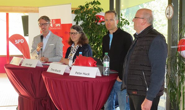 Gleich zwei Abgeordnete des Deutschen Bundestags hatten die Veranstalter für den Gesprächsabend gewinnen können: Dr. Lars Castellucci, SPD-Abgeordneter des hiesigen Wahlkreises, und Ute Vogt, Vizepräsidentin der weltgrößten Wasserrettungsorganisation DLRG. Auch der ehemalige Eberbacher Triathlonprofi Timo Bracht und SPD-Stadtrat Peter Huck, der beruflich stellvertetender Schulleiter am Hohenstaufen-Gymnasium war, diskutierten vor rund 25 Zuhörern mit.
