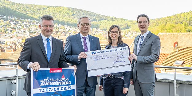 Je weiter der Frühling im Neckartal fortschreitet, desto mehr steige auch bei den Verantwortlichen der Volksbank Neckartal die Vorfreude auf die Schlossfestspiele Zwingenberg, betonte Vorstandsvorsitzender Ekkehard Saueressig bei der Übergabe des symbolischen Schecks am Hauptsitz der Bank in Eberbach.