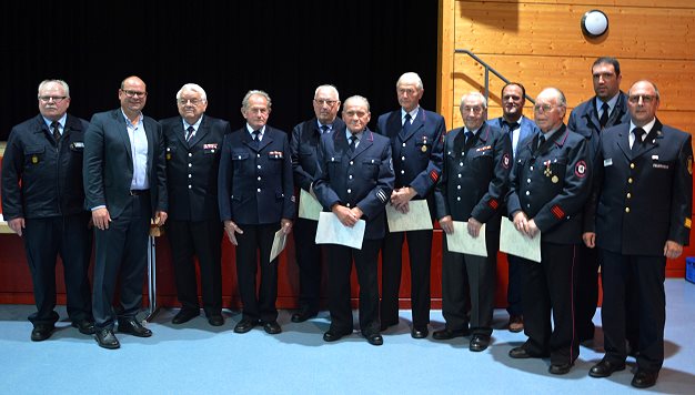 Mit dem Goldenen Brandschutzehrenzeichen am Bande für 40-jährige aktive und pflichttreue Dienste in Feuerwehren wurden Klaus Bartmann, Ludwig Eifert, Matthias Grim, Thomas Ihrig, Klaus Kleinhans, Jürgen Krieger, Ortwin Maurer, Jürgen Neff, Werner Neff, Reiner Pokoj, Uwe Sauer und Hans-Jürgen Ziegler geehrt. Das Goldene Brandschutzehrenzeichen am Bande für 50-jährige aktive und pflichttreue Dienste in Feuerwehren wurde an Helmut Kaufmann überreicht.