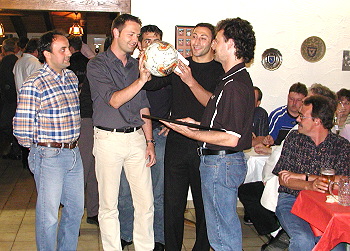 Erste Meisterschaft nach 28 Jahren gebührend gefeiert Wolfgang Link (rechts) erhielt von seiner Mannschaft ein Erinnerungsfoto und einen Ball ! mit den Unterschriften der Meistermannschaft (Foto:Claussen)(jc) Am gestrigen Abend ging es im Fußballer-Clubhaus in der Au hoch her, denn es gab etwas großes zu feiern. Die erste Meisterschaft einer Seniorenmannschaft des SV 24 Eberbach seit 28 Jahren. Zwar hatte man in dieser Zeit bereits mehrfach einen Aufstieg zu feiern gehabt, allerdings immer über einen zweiten Tabellenplatz und über Relegationsspiele. Man habe es auf diesem Wege sogar schon bis in die Bezirksliga geschafft, berichtete der 1. Vorsitzende Heinz-Georg Luyven bei seiner Begüßung der zahlreichen Mitglieder, Freunde des Vereins und Ehrengäste im vollbesetzten SVE-Heim, ehe er eine Botschaft des Ehrenvorsitzenden Michael Quiring verlas, der beruflich verhindert war. Für den terminlich ebenfalls verhinderten Bürgermeister überbrachte dessen Stellvertreter Hermann Bussemer die Grüße der Stadt Eberbach und des Gemeinderats. Der Vorsitzende des Sportausschusses und eingefleischte VfB-Mann, Dieter Jeitner, bekannte anschließend, er sei inzwischen „fast ein halber Svler“ weil er in der vergangenen Saison mit Freude so viele Spiele des Vereins besucht habe. Eine Feststellung der anschließend VfB-Vorsitzender Joachim Scheible noch eins draufsetzte. Er outete sich nämlich als „ganzer Svler“, der seit Jahren zahlendes Mitglied beim SV Eberbach sei. Als bekannter Gegner allzu großer Rivalität zwischen den beiden zukünftigen A-Ligisten lenkte er im Rahmen seiner Grußrede wieder einmal die Augen auf die vielen Gemeinsamkeiten beider Clubs. In der Folge überbrachten weitere Vertreter Eberbacher Vereine Grüße und eine Menge Fußbälle, so dass in der nächsten Saison für jedes Pflichtspiel ein neues Leder zur Verfügung stehen dürfte. Auch Staffelleiter Erhard Mayer hatte zwei der begehrten Kugeln im Gepäck, als er die Grüße des Fußballkreises Heidelberg überbrachte.