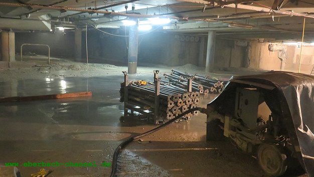 Im März gab die Verwaltung in einer öffentlichen Gemeinderatssitzung bekannt, dass bei den Strahlarbeiten mit einem Hochdruckgerät die Betondecken löchrig und instabil geworden seien, weshalb in Einzelabschnitten eingeschalt und aufbetoniert werden müsse. Aktuell ist die Tiefgarage kaum wiederzuerkennen (siehe Fotos). Jede Menge Stahlsprieße sind für die Deckenabstützungen im Einsatz, Belüftungs- und Wasserabsaugeinrichtungen sind in Betrieb, die komplette Technik wurde abgebaut oder provisorisch abgehängt, um die Betondecken zugänglich zu machen. Das bei den Strahlarbeiten verwendete Wasser wird abgesaugt und oberirdisch maschinell gereinigt, bevor es in die Kanalisation kommt. Bauschutt wird mit Radladern aus den unterirdischen Geschossen gefahren und entsorgt. Manfred Schüssler vom Eberbacher Stadtbauamt lobt die Arbeitsausführung durch die beauftragte Firma AZ Bautenschutz aus Ludwigsburg, die auch samstags arbeite. Man liege aktuell etwa vier Wochen hinter dem geplanten Zeitfenster, so Schüssler. In vier Bauabschnitten werden Teile der Betondecken im ersten Untergeschoss teils unter Einsatz einer leistungsstarken Hochdruck-Schneidemaschine ausgeschnitten, neu verschalt, mit frischem Stahl bewehrt und betoniert. Um die Stabilität des kompletten Bauwerks zu gewährleisten, mussten nach Berechnungen eines Statikers Verstärkungen und Abstützungen eingebaut werden. Um eine erneute Schädigung des Betons in den kommenden Jahren zu verhindern, soll eine Schutzschicht aufgebracht werden. Außerdem werden neue farbliche Fahrbahnmarkierungen und Parkplatzeinteilungen vorgenommen.
