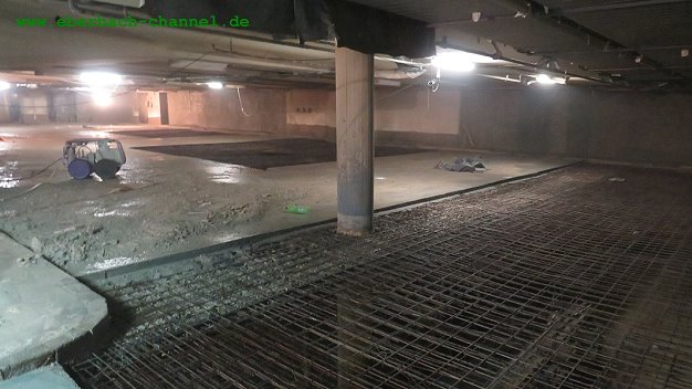 Im März gab die Verwaltung in einer öffentlichen Gemeinderatssitzung bekannt, dass bei den Strahlarbeiten mit einem Hochdruckgerät die Betondecken löchrig und instabil geworden seien, weshalb in Einzelabschnitten eingeschalt und aufbetoniert werden müsse. Aktuell ist die Tiefgarage kaum wiederzuerkennen (siehe Fotos). Jede Menge Stahlsprieße sind für die Deckenabstützungen im Einsatz, Belüftungs- und Wasserabsaugeinrichtungen sind in Betrieb, die komplette Technik wurde abgebaut oder provisorisch abgehängt, um die Betondecken zugänglich zu machen. Das bei den Strahlarbeiten verwendete Wasser wird abgesaugt und oberirdisch maschinell gereinigt, bevor es in die Kanalisation kommt. Bauschutt wird mit Radladern aus den unterirdischen Geschossen gefahren und entsorgt. Manfred Schüssler vom Eberbacher Stadtbauamt lobt die Arbeitsausführung durch die beauftragte Firma AZ Bautenschutz aus Ludwigsburg, die auch samstags arbeite. Man liege aktuell etwa vier Wochen hinter dem geplanten Zeitfenster, so Schüssler. In vier Bauabschnitten werden Teile der Betondecken im ersten Untergeschoss teils unter Einsatz einer leistungsstarken Hochdruck-Schneidemaschine ausgeschnitten, neu verschalt, mit frischem Stahl bewehrt und betoniert. Um die Stabilität des kompletten Bauwerks zu gewährleisten, mussten nach Berechnungen eines Statikers Verstärkungen und Abstützungen eingebaut werden. Um eine erneute Schädigung des Betons in den kommenden Jahren zu verhindern, soll eine Schutzschicht aufgebracht werden. Außerdem werden neue farbliche Fahrbahnmarkierungen und Parkplatzeinteilungen vorgenommen.