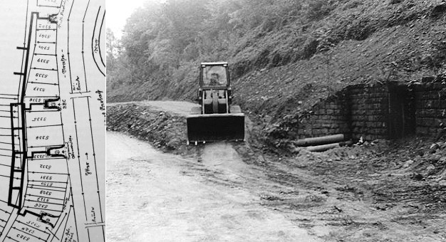 Zunächst wurde im April 1944 eine “Notbrücke” über die Itter für den Fluchtweg aus dem Firmengelände gebaut. Die beiden Firmen hatten damals zeitweise rund 2.000 Mitarbeiter. Fast alle mussten dann bei dem Bau der Stollen ab dem Sommer 1944 mit anpacken. Das Steinmaterial aus dem Berg wurde mit Loren (kleine Wagen mit Kippmulde) auf einem Gleis über die Notbrücke auf ein Gelände neben den Firmen gefahren und dort deponiert. Es wurden insgesamt vier Eingänge in das Stollensystem angelegt. Die Stollenröhren wurden zunächst einige Meter in den Berg hinein getrieben und dann teilweise durch Querstollen miteinander verbunden. Gearbeitet wurde mit Presslufthammer und Sprengungen. In einigen Bereichen wurde Stahlbeton zur Stabilisierung eingebaut, andere Teile wurden nur mit Holzstützen gesichert.