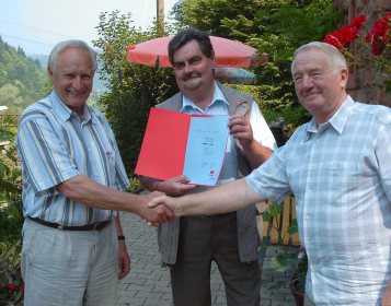 Robert Joho für 50-jährige Gewerkschaftszugehörigkeit geehrt Links Jubilar Robert Joho bei der Verleihung der 1. Verdi-Ehrennadel und Ehrenurkunde durch Geschäftsführer Bernd Hardt (Mitte) und den Eberbacher DGB-Vorsitzenden Hans Dahlke. (Foto:privat)(tw) (ub) Für 50-jährige Mitgliedschaft wurde die erste Ehrennadel der neu gegründeten Gewerkschaft Verdi an Robert Joho verliehen. Vor 51 Jahren, genau am 15.Oktober 1951, wurde Robert Joho als Auszubildender der Stadt Eberbach von seinem Chef Alois Hock als ÖTV-Mitglied geworben. Die Verdi-Neugründung mit der Zusammenlegung vieler Einzelgewerkschaften und Umstellung von IT-Systemen ermöglichten nun im 51. Jahr Zugehörigkeit die Ehrung von Robert Joho. Für den Geschäftsführer und Bezirksvorsitzenden von Verdi Heidelberg, Bernd Hardt, war es eine besondere Ehre, in Anwesenheit von Hans Dahlke, DGB-Vorsitzender in Eberbach und Seniorenvorsitzender Verdi Heidelberg-Buchen, Robert Joho mit der 1. Verdi-Ehrennadel für die langjährige Treue zur Gewerkschaft auszuzeichnen und ihm eine Ehrenurkunde, persönlich vom Verdi-Vorsitzenden Frank Bsirske unterzeichnet, zu überreichen. Geschäftsführer Hardt, der rund 20.000 Mitglieder in seinem Zuständigkeitsbereich betreut, betonte, dass die Ehrung eines solch seltenen Jubiläums stets in einen familiären Rahmen eingebunden ist. Im Anschluss an die Ehrung erfrischten sich die Gratulanten bei tropischer Sommerhitze mit einem kleinen Imbiss.