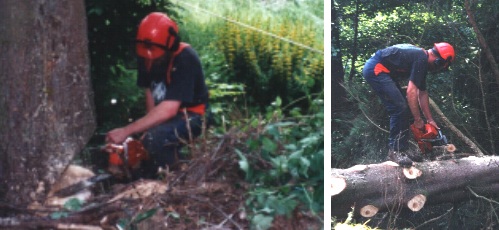 Technisches Hilfswerk fällt Bäume Die Bilder zeigen die Arbeiter bei Ihren Baumfällarbeiten im Holdergrund. (Fotos:privat)(bm) (as) Am Mittwoch, 12.Juni, wurde am Nachmittag die erste Bergungsgruppe des THW Eberbach alarmiert. Im Holdergrund mussten drei Bäume beseitigt werden. Der erste Baum, eine Tanne, fiel erst nachdem eine beidseitige Kerbe in den Stamm hineingetrieben und der Stamm mit vier Keilen zu Fall gebracht wurde. Nachdem die Helfer den ersten Baum zerlegt hatten, ging es an den zweiten Baum, eine Erle. Die THWler zogen den angeschlagenen Baum um und entasteten ihn. Der letzte Baum war der kleinste aber zugleich auch der kniffligste. Sein Stamm war schräg über den Holderbach gewachsen. Er fiel dank fachmännischer Fällung günstig, und so stellte auch der letzte Baum kein Problem für die Helfer dar. Die Helfer arbeiteten trotz der großen Hitze schnell weiter und so blieb noch Zeit, um am Abend beim Grillen zusammenzusitzen. Der Leiter der Aktion, Markus Haas, war mit der Leistung der Helfer sehr zufrieden.