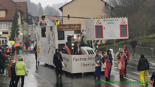 Es folgten zahlreiche Fußgruppen und Motivwagen. Neben der KG Kuckuck mit vielen Gruppen waren auch der Club Eulenspiegel aus Rockenau, die KG Urmel aus Neckarwimmersbach, die CG Hirschhorner Ritter und die Neckargemünder Karnevalgesellschaft stark vertreten. Aus Eberbach mit dabei waren außerdem der Eberbacher Sportclub, die Abis des HSG, Die HGE, die Fastnachts-Freunde, die Rasselbande, die Neckarwimmersbacher Ratze, “Pleutersbach & Friends” und die “Wilde 13” aus Brombach. Weitere Gruppen waren aus Igelsbach, Heddesbach, aus dem Odenwald, Neckargerach und aus dem Sensbachtal gekommen. Aufwändige Motivwagen hatten wieder die “Wilden aus dem Ittertal” und die Karnevalfreunde “Haidebow” mitgebracht. Für die musikalische Begleitung mit schmissigen Rhythmen Blasinstrumenten sorgten die “Schnoogebadscher” aus Binau, “Agilastra Spiriti” aus Aglasterhausen, die Feuerwehrkapelle aus Waldkatzenbach und der Spielmannszug aus Lohrbach. Das THW sicherte das Zugende ab.